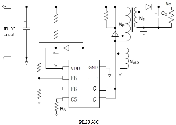 PL3366C在復合模式下工作,實現了低靜態功耗、低音頻噪聲和高效率。它在滿載時工作在PFM模式,隨著負載降低逐漸進入綠色模式,提高系統效率。此外,PL3366C還具備多重保護功能,包括逐周期峰值電流檢測、VDD欠壓/過壓保護、輸出過壓保護、輸出短路保護和過溫保護等。典型應用圖如下所示
