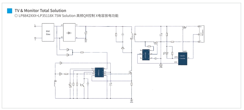 本方案旨在設計一款75W的電源,適用于需要高效率和小體積的應用場景。方案采用高頻QR控制器LP8842xXX,以及基于GaN技術的LP88G24xxx,以實現高效率和高功率密度的設計目標。