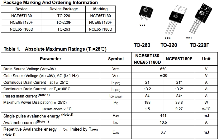 NCE65T180F新潔能TO-220F封裝650V 21A N溝道MOS管場(chǎng)效應(yīng)管