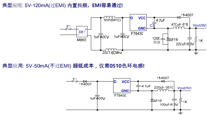 在成本方面,FT8430也表現出色。它支持更便宜的電感,如5V120mA輸出時,僅需470uH的6*8工字電感;5V50mA輸出時,更是只需220uH的0510色環電感。這種對低成本電感的支持,使得FT8430在競爭激烈的市場中更具性價比。