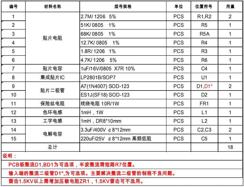 BOM表(物料清單)是實現LP2801B 12V150mA Buck設計的關鍵文件,它詳細列出了電路中所需的所有元件及其規格。以下是該設計的BOM表內容: