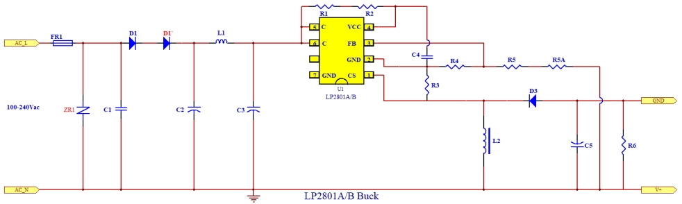 LP2801B 12V150mA Buck設計的原理圖是整個電源模塊設計的核心。其電路結構主要包括以下幾個部分: