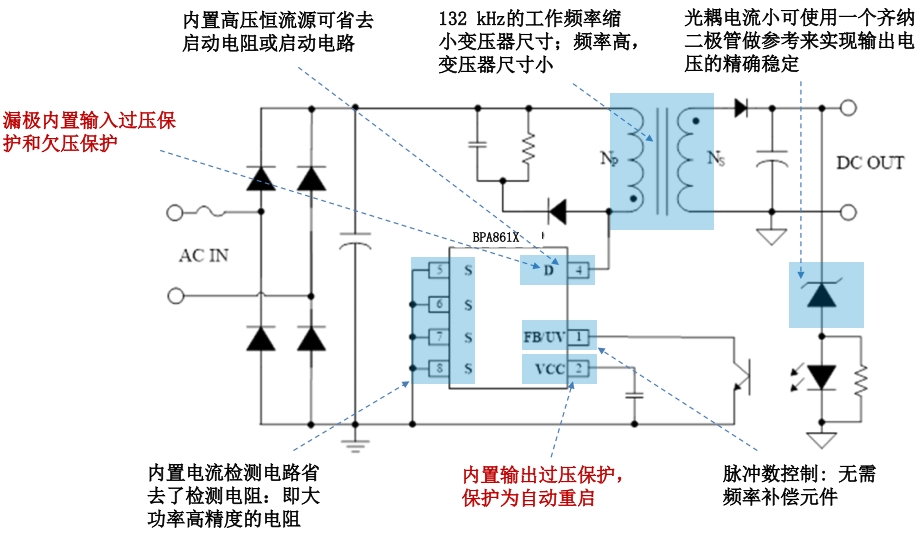 在設(shè)計細(xì)節(jié)上,BPA861X 也展現(xiàn)出了諸多優(yōu)化之處。它內(nèi)置了高壓恒流源,可以省去啟動電阻或啟動電路,簡化了外圍電路設(shè)計,降低了成本。同時,BPA861X 還內(nèi)置了電流檢測電路,省去了檢測電阻,這不僅減少了外圍元件數(shù)量,還提高了檢測精度和可靠性。相比之下,友商產(chǎn)品在這些方面往往需要額外的外圍元件來實現(xiàn)相同的功能,這不僅增加了設(shè)計復(fù)雜度和成本,還可能因元件數(shù)量的增加而降低系統(tǒng)的可靠性。