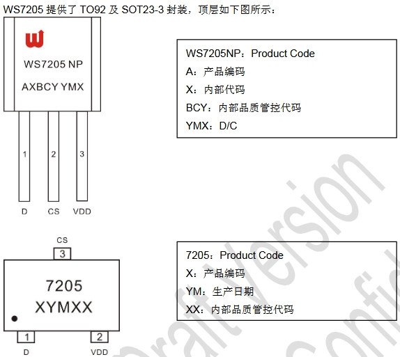 器件標識方面,WS7205NP為產(chǎn)品代碼,其中: