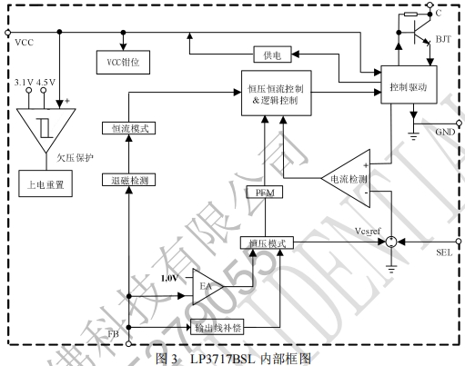 LP3717BSH 通過外置電阻,可調原邊峰值電流,再通過變壓器原副邊匝比來設置輸出恒流點;通過設定 FB 上偏電阻和下偏電阻來設置輸出恒壓點。為了實現系統成本的極致簡化,LP3717BSH 內置啟動電路,外圍不需要啟動電阻;采用自供電的方式來取消輔助繞組 VCC 供電二極管。