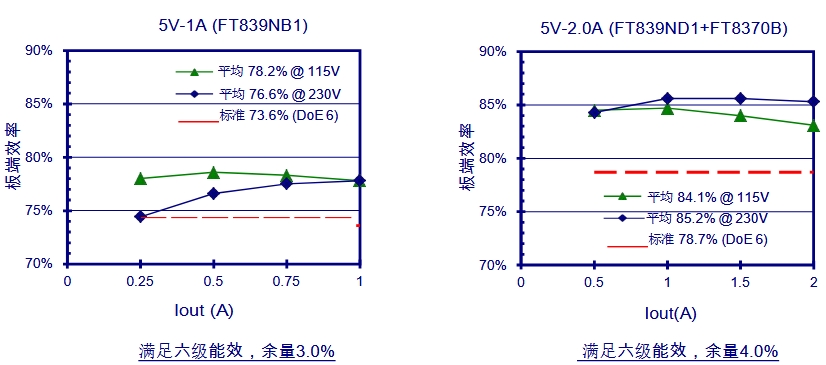 FT839xx/FT8393xx系列芯片在設計上充分考慮了能效優化,能夠輕松滿足DoE和CoC六級能效標準。以FT839NB1為例,在115V和230V輸入電壓下,其平均效率分別達到了78.2%和76.6%,遠高于標準要求的73.6%,且余量達到了3.0%。這意味著在實際使用中,該芯片不僅能夠高效地將電能轉換為設備所需的能量,還能在不同負載條件下保持穩定的能效表現。