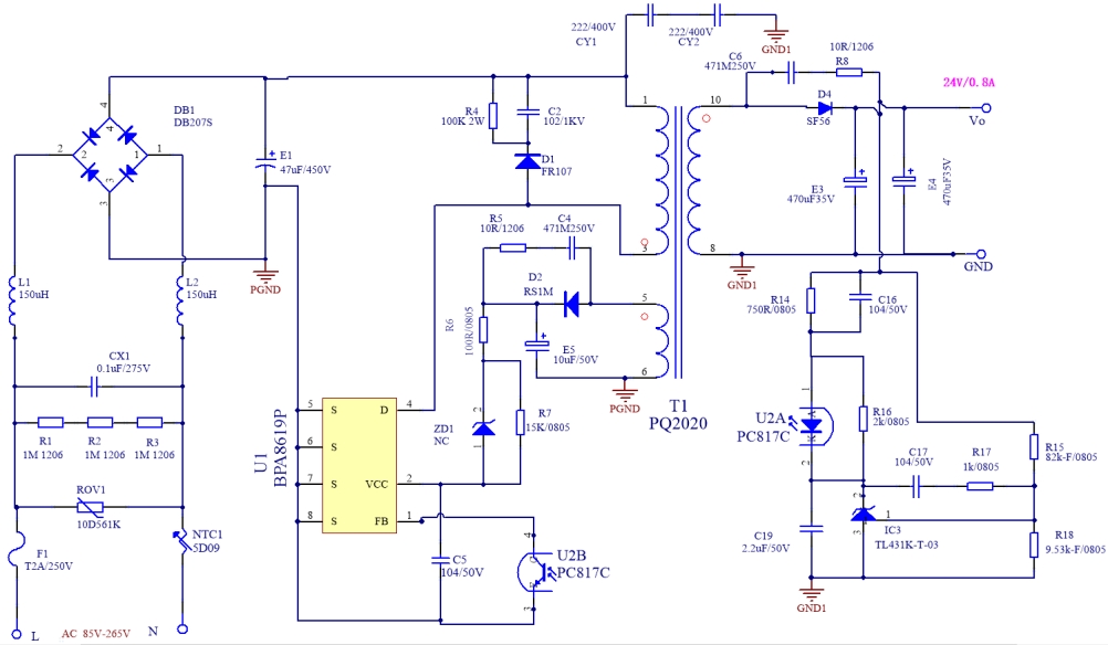 BPA8619P 的電路圖是整個(gè)電源方案的核心,它詳細(xì)展示了電源電路的各個(gè)組成部分以及它們之間的連接關(guān)系。從電路圖中可以看出,該電源采用了典型的反激式開關(guān)電源拓?fù)浣Y(jié)構(gòu),這種結(jié)構(gòu)具有電路簡單、成本較低、易于實(shí)現(xiàn)等優(yōu)點(diǎn),同時(shí)也能滿足較高的性能要求。