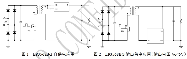 在自供電應(yīng)用中,LP3568BG通過其D腳連接輸出電壓,利用內(nèi)置MOS的體二極管對(duì)輸出電容充電,實(shí)現(xiàn)自供電啟動(dòng)。當(dāng)VCC電壓達(dá)到開啟閾值時(shí),芯片內(nèi)部控制電路開始工作,MOS管正常導(dǎo)通和關(guān)斷,電流從MOS管的溝道流過,而非體二極管,從而實(shí)現(xiàn)高效的同步整流。這種應(yīng)用方式適用于需要簡化電路設(shè)計(jì)、減少外部電源依賴的場景。