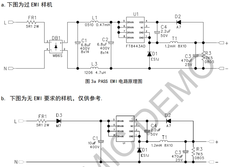 FT8443AD內(nèi)置650V高壓MOS,使得IC在工作過程中溫度較低,進(jìn)一步提升了電源的可靠性。同時(shí),該方案還具備過壓、欠壓、過溫、過流以及輸出短路保護(hù)等多種保護(hù)功能,全方位保障電源的安全運(yùn)行,延長電源的使用壽命。