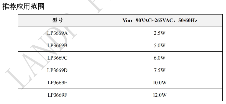 LP3669系列提供了從2.5W到12.0W的多種輸出功率選擇,能夠滿足從低功耗到高功耗設備的不同需求。這種多樣化的功率選擇使得工程師可以根據具體應用場景選擇最適合的型號。