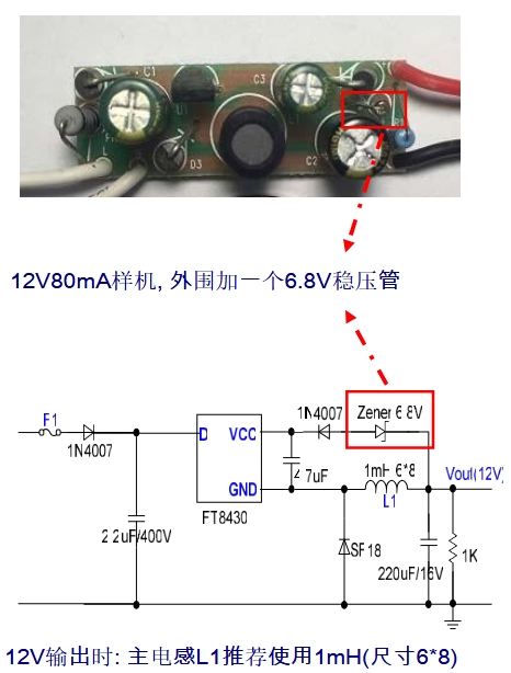 在該電路中,F(xiàn)T8430通過一個470uH的工字電感和一個1uF/400V的電容實現(xiàn)5V-120mA的輸出。該電路具有內(nèi)置抖頻功能,能夠輕松通過EMI測試,適用于需要高精度電壓和低待機(jī)功耗的小家電設(shè)備,如智能插座、智能照明設(shè)備等。