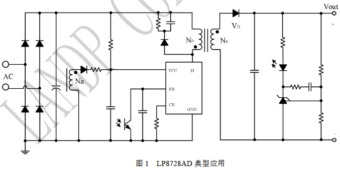 LP8728AD的典型應(yīng)用電路如下圖所示。在該電路中,AC輸入電壓通過(guò)變壓器的原邊繞組連接到D引腳,CS引腳用于檢測(cè)開(kāi)關(guān)電流,F(xiàn)B引腳通過(guò)光耦接收副邊反饋信號(hào),VCC引腳為芯片提供電源。