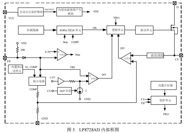 峰值電流控制模塊:通過(guò)CS引腳檢測(cè)開(kāi)關(guān)電流,實(shí)現(xiàn)精確的電流模式控制。
