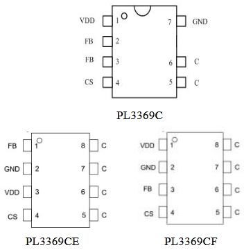 | 引腳功能 | PL3369C (SOP-7) | PL3369CE (SOP-8) | PL3369CF (SOP-8) |