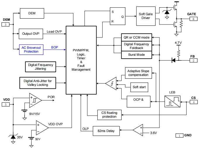 全面的保護功能:包括欠壓保護、過壓保護、逐周期電流限制、過載保護等,確保電源系統在各種異常情況下都能安全運行。