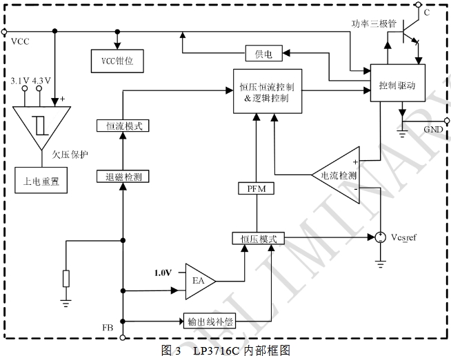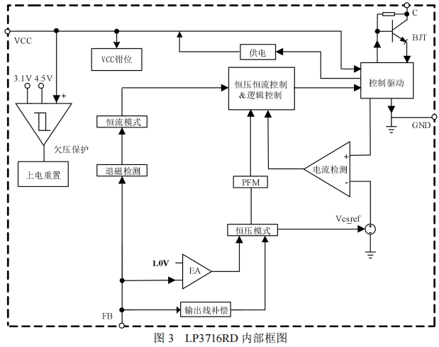 LP3716RD:DIP7的金屬引腳直接形成散熱通道,同功率下溫度降低18℃,為28W應用預留余量。LP3716RD內部框架圖如下所示~