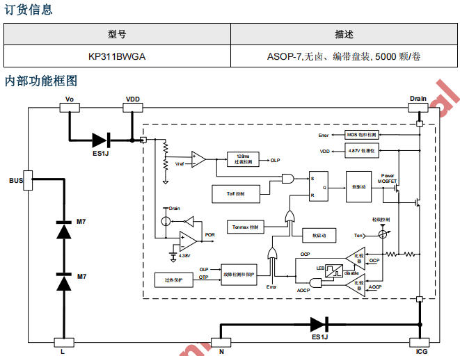 | 保護 | 7 合 1 | UVLO/OCP/OVP/OTP/OLP/LEB/自恢復(fù) |