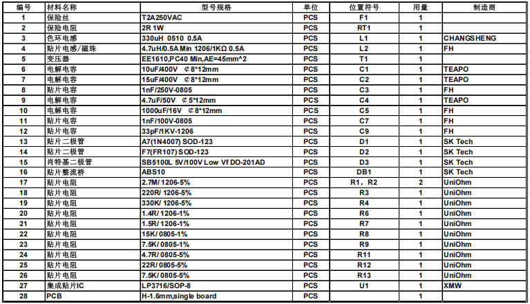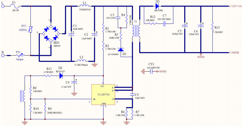 LP3716 12V1A自供電PSR控制芯片參考設計(電路原理圖及DEMO樣板)