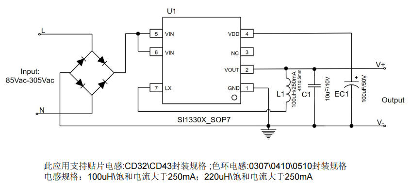 220V→保險絲→整流二極管1N4007→100μH電感(CD43)→10μF/10V陶瓷+100μF/50V電解→SI1330X→3.3V/5V