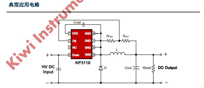 KP3116 是一款高性能低成本 PWM 控制功率開關,適用于離線式小功率降壓型應用場合,外圍電路簡單、器件個數少。同時產品內置高耐壓 MOSFET 可提高系統浪涌耐受能力。