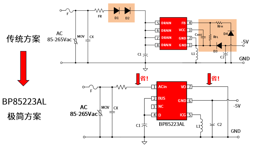 BP85223AL 芯片采用多模式控制技術,降低系統待機功耗,提高效率和動態性能,減小系統工作在輕載時的噪聲。