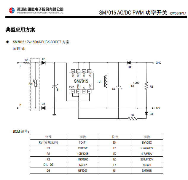 SM7015 是采用電流模式 PWM 控制方式的功率開關芯片,集成高壓啟動電路和高壓功率管,為低成本開關電源系統提供高性價比的解決方案。芯片應用于 BUCK 系統方案,支持 12V/18V 輸出電壓,很方便的應用于小家電產品領域。并提供了過溫、過流、過壓、欠壓等完善的保護功能,保證了系統的可靠性。