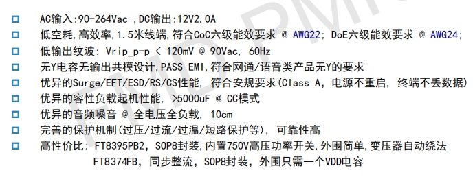 高效率與低功耗:FT8395PB2和FT8374FB的組合提供了高效率的電源轉換,同時在輕載時保持低功耗,滿足六級能效要求。