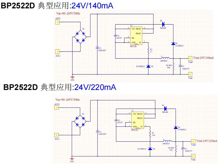 以BP2522D為例,其在24V輸出應用中的典型電路設計如下:
